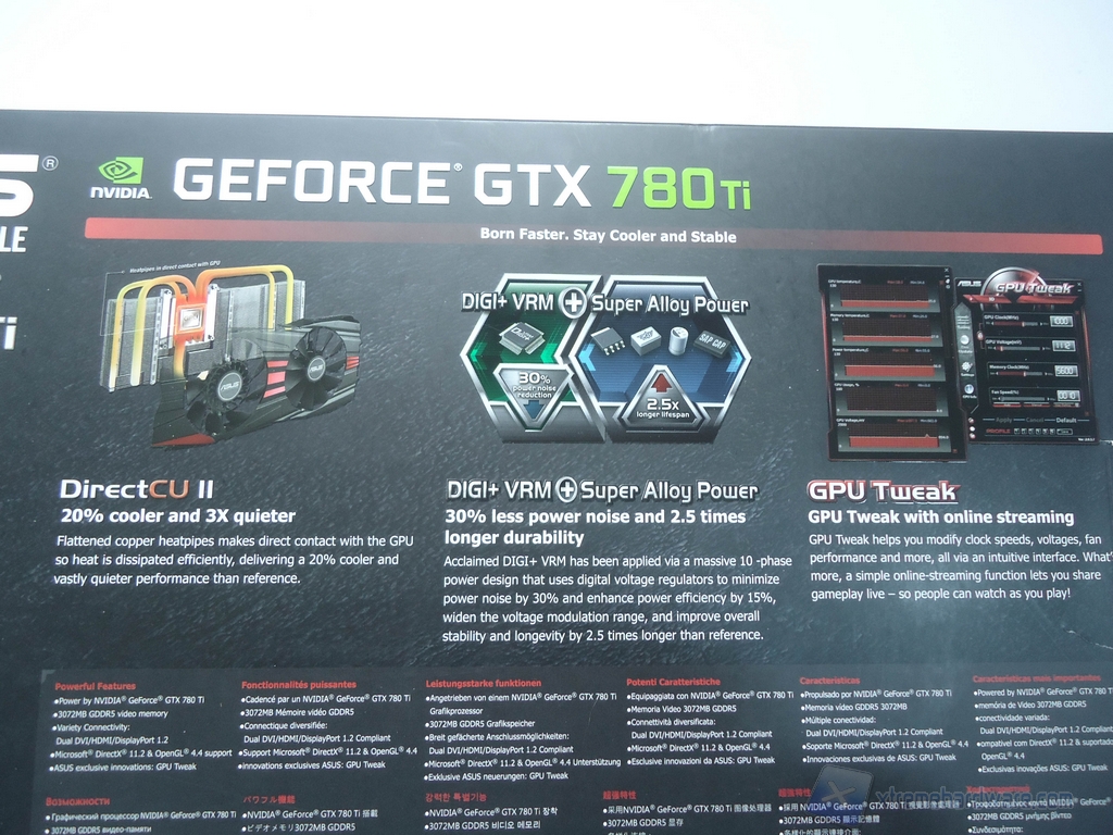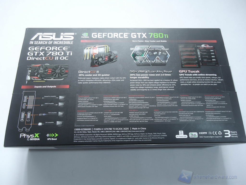 Ora passiamo ad analizzare brevemente come si presenta la scatola in cui è contenuta la GTX 780 Ti DirectCU II OC e il bundle compreso nella confezione. La scatola è la classica fornita da Asus per le sue schede video. Frontalmente troviamo un’immagine esplosa del dissipatore montato sulla scheda. Più in basso invece troviamo specificato che questa VGA è una versione overcloccata di fabbrica, dispone di 3GB di memoria ed infine è segnalato che le fasi di alimentazione VRM sono gestite da un controller digitale DIGI+. In basso a destra troviamo infine il nome della serie che in questo caso è GTX 780 Ti.
